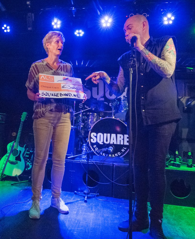 De temperatuur loopt op naar recordhoogte,zo zelfs dat de lens van mijn camera beslaat,na twee jaar Corona is het een verademing om weer eens bezwete muziekliefhebbers in een uitverkochte venue mee te maken. Het is vooral een feest der herkenning, kijken en luisteren een walk down memory lane, jeugdherinneringen van een generatie opgegroeid in de jaren 60 tot nu. Twee en half uur later klinken de slotakkoorden van de band bezweet en met een zucht van opluchting die van het gezicht is af te lezen. Na een geslaagde avond en weken van repeteren zijn dit de vruchten die hier worden afgeworpen en kan ‘Square’ het welverdiende applaus in ontvangst nemen van de aanwezige muziekliefhebbers .De afsluiting is het overhandigen van een check van 3000 euro aan de voorzitter van ALS Westland, dit is tenslotte waar de avond omdraaide de verwachting is dat het totaal bedrag zeker wel kan oplopen.