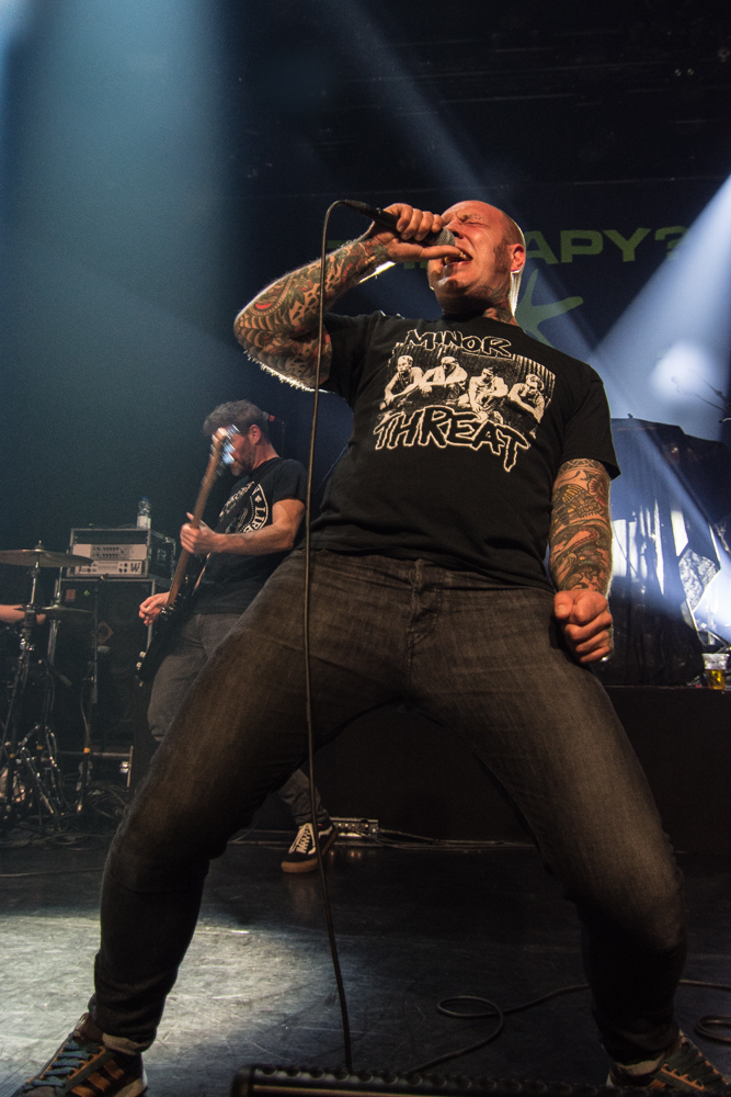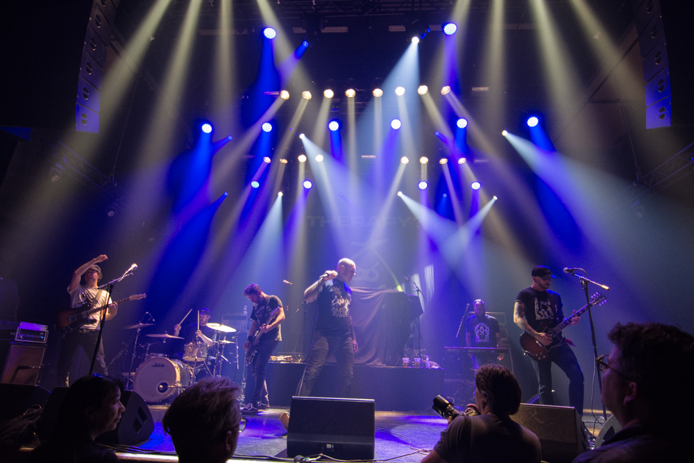 Na het zestal wordt het podium leeg gehaald en ontdaan van overtollig instrumentarium, wat overblijft is een karig podium wat in schril contrast staat met ‘Sparrow falls’ hier voor. Onder luid gejoel wordt ‘Therapy’ onthaald en betreed het drietal het podium.