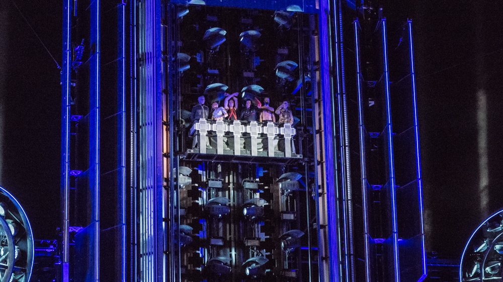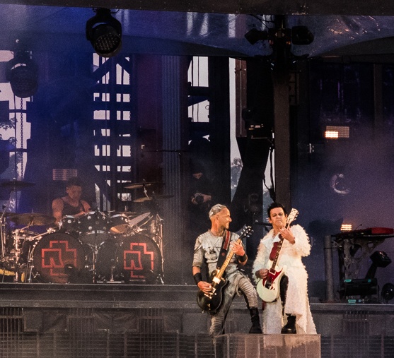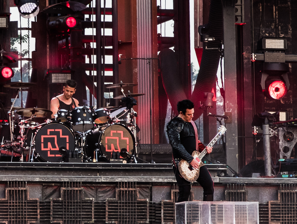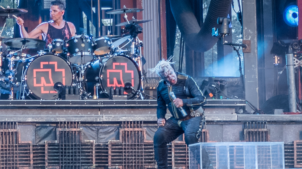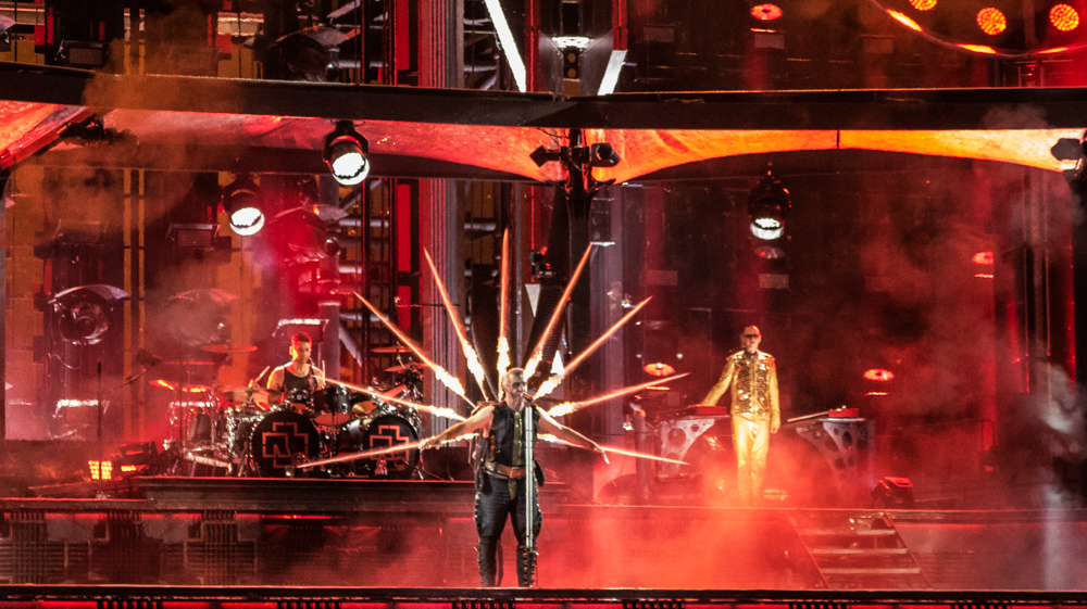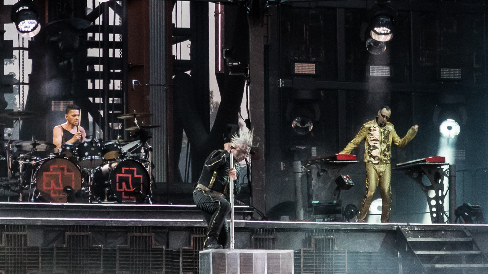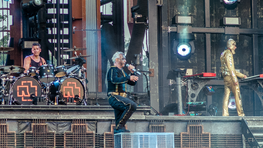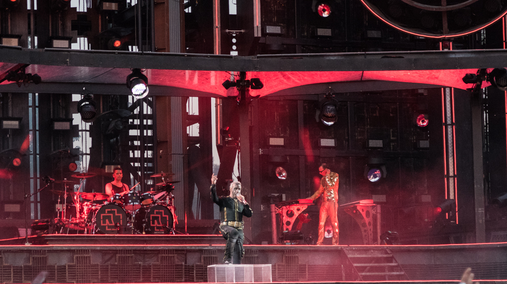 Het podium is grotesk, de torens in het midden van het park reiken tot aan de hemelpoort waar vanuit gedurende het optreden vlammen huizenhoog naar zuurstof zoeken. De opbouw van het podium grenst aan het onmogelijke. De aandacht voor de details on stage zijn geweldig en maakt de band in verhouding met het podium zeer nietig.Vaak sluit een band af met een knal, echter bij ‘Rammstein’ werkt het net even anders. Op de klanken van het openings opus ‘Armee der Tristen’ en het omhoog gaan van een enorm led scherm met het bandlogo, neemt Christoph Schneider plaats achter het drumstel.