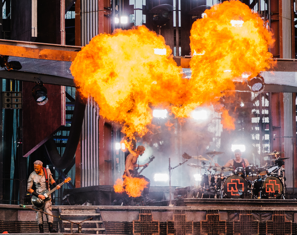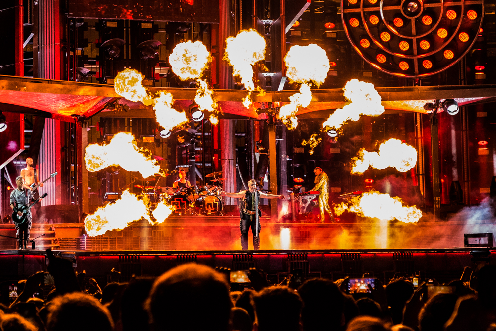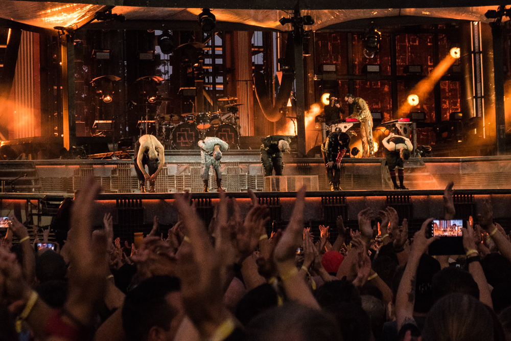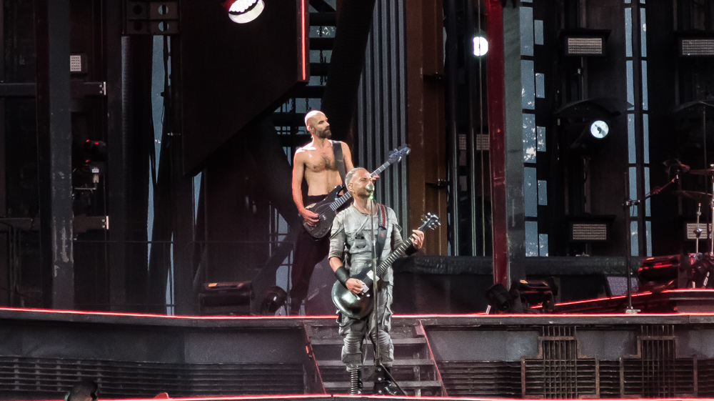 Na al deze pyro uitbarstingen lijkt het podium op een brandende ruïne waar de rookpluimen een weg naar buiten proberen te vinden. De pyrotechniek vindt niet alleen op het podium plaats, maar ook rondom de arena waar de torens, wat lijkt op het affakkelen van de petrochemische industrie, met immense vlammen die het Goffertpark worden uitgeblazen. Dit bereikt bij het epische ‘Sonne’ een hoogtepunt. De zengende warmte trekt door de aanwezige fans, mocht er een hel bestaan dan hebben wij die aanwezigheid gevoeld tijdens “Sonne’.