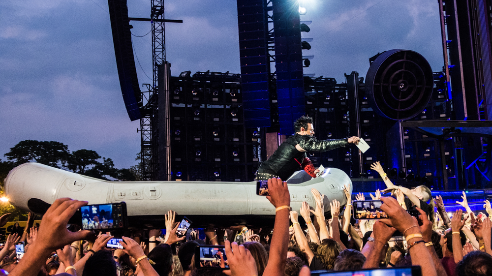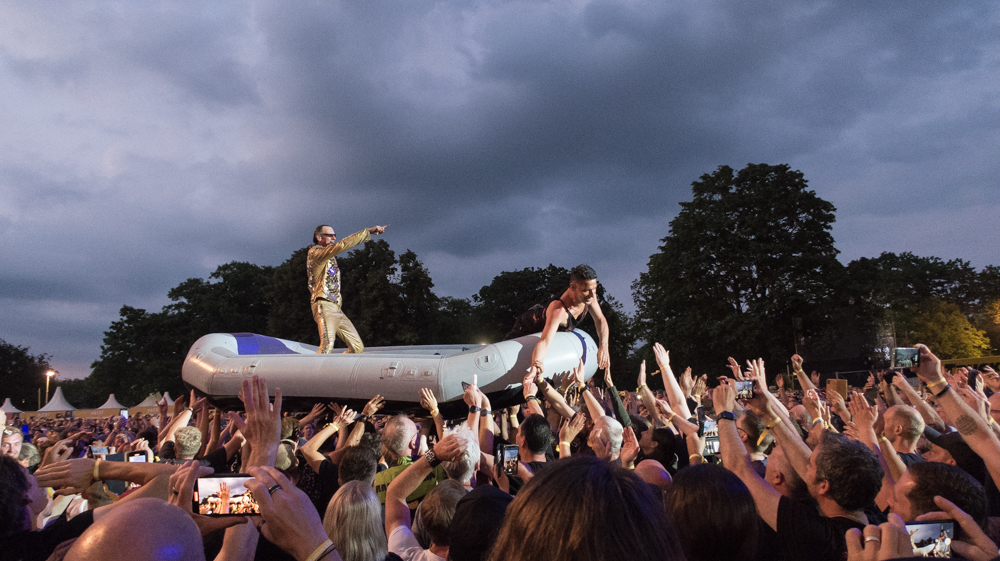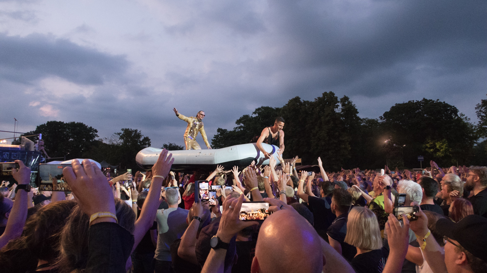 De Dinkies mogen niet ontbreken na het akoestische ‘Engel’ onder begeleiding van het gepassioneerde pianisten ‘Duo Abélar’ Katherine Nikitine en Héloïse Hervouët. Vervolgens stapt de band verdeeld in Dinkies om van daaruit op het publiek surfend het main podium te betreden en worden verwelkomt door Heer Lindeman. Het ingetogen ‘Engel’ was het rustpunt van de avond. Terug op het podium klinken de klanken van het contovercieele en brutale ‘Ausländer’. Rammstein schuwt het niet om de kritische aspecten in de samenleving aan de kaak te stellen op eigen creatieve wijze.