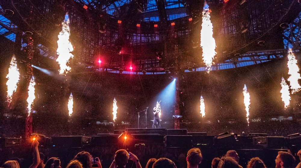 Het begint rumoeriger en onrustiger te worden wanneer de led verlichting de wachttijd voor de start van het optreden projecteert. Helaas Is alles een ietwat vertraagd door een storing in de ticketcontrole en begint het optreden ongeveer een half uur later. Boven het podium hangt een enorme lampenkap met led verlichting en rondom het podium verschillende kleine podia met daarboven led schermen die het concert registreren en waarop de band komt te spelen. De lampenkap zakt op het podium en worden de voorbereidingen genomen voor de hoofdact.